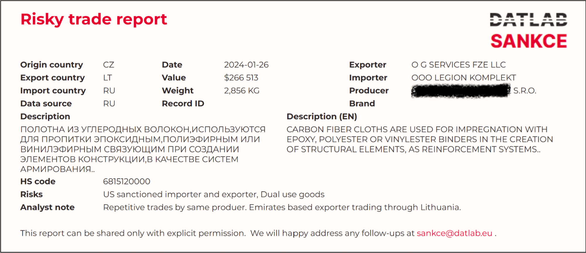 This is an example of a transaction identified as high-risk. The goods of a Czech company were exported to Russia, with both the seller and the buyer listed on the U.S. sanctions list.